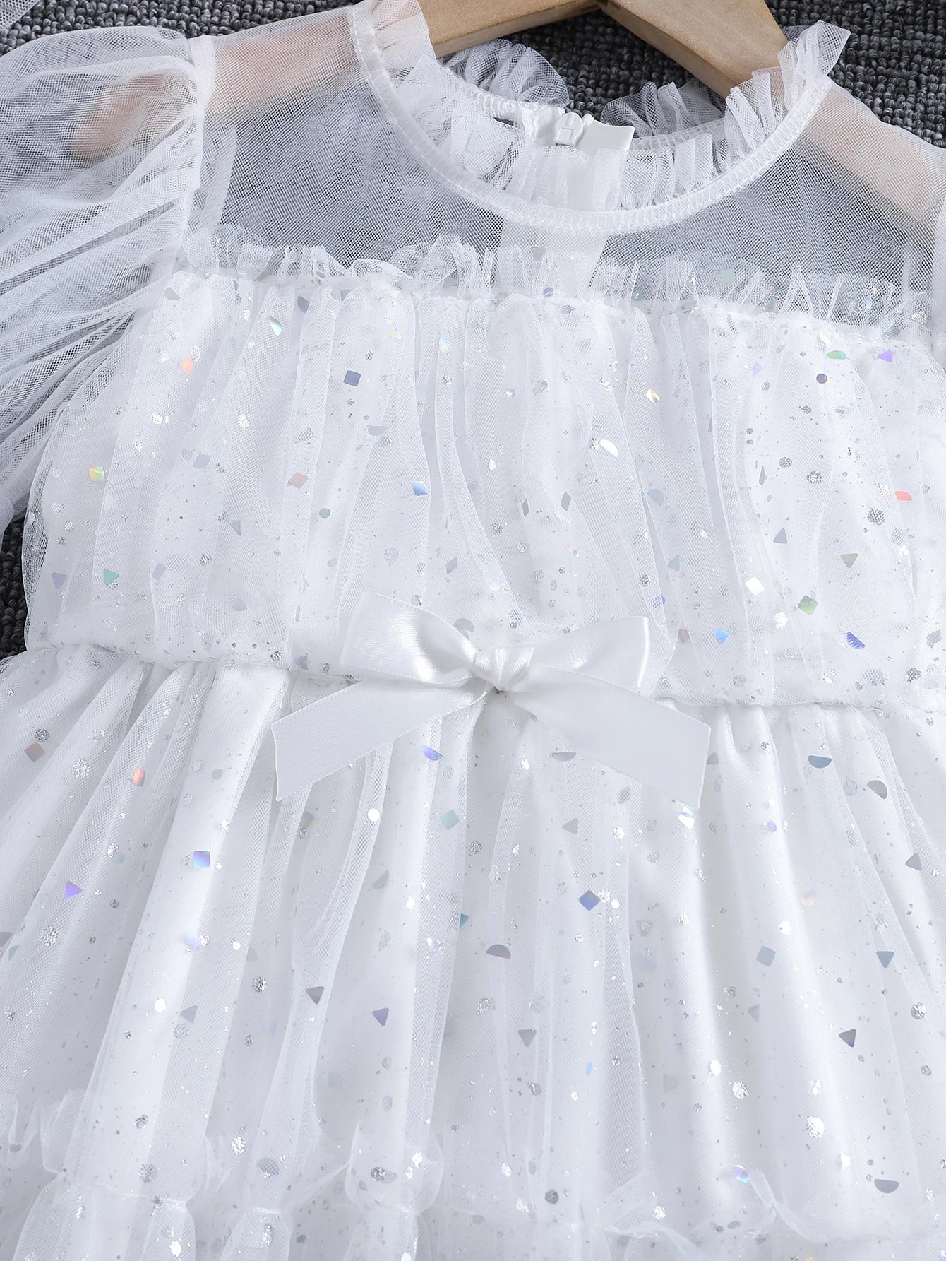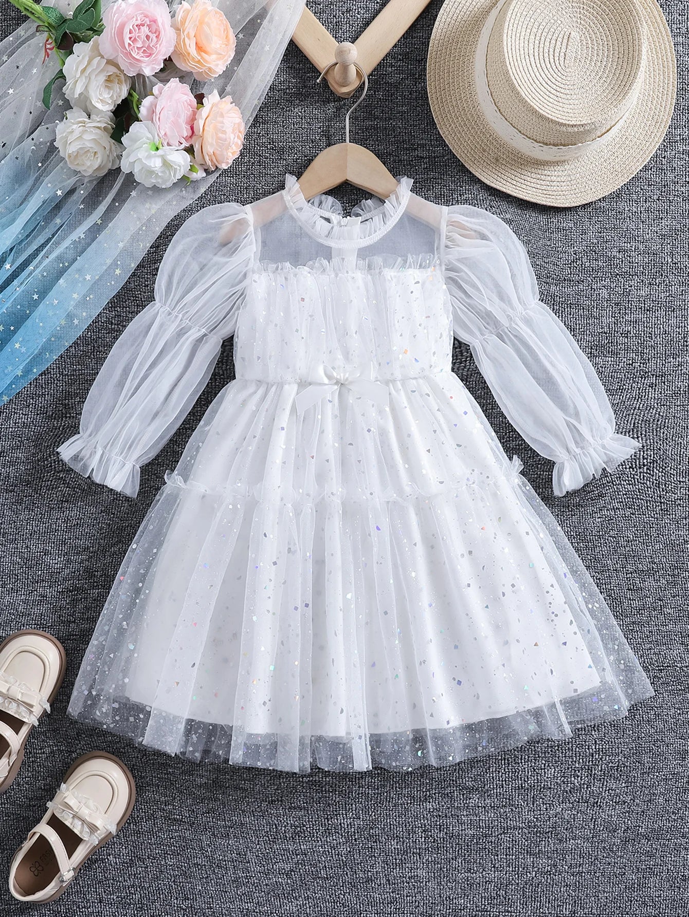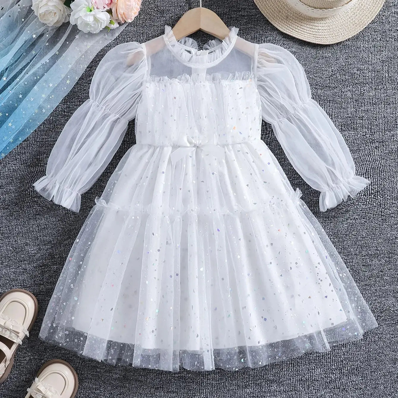Girls' spring, summer and autumn fashionable sequined mesh puffy princess dresses, stand-up collar ruffled long-sleeved ladylike