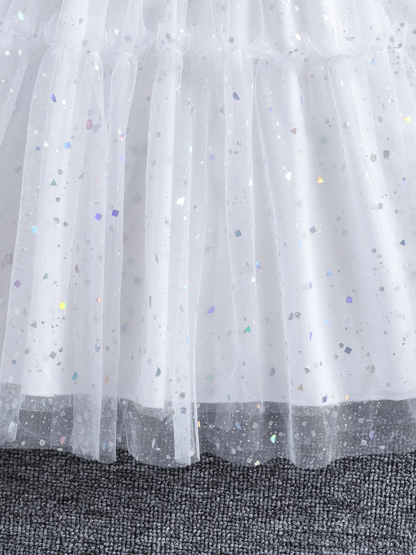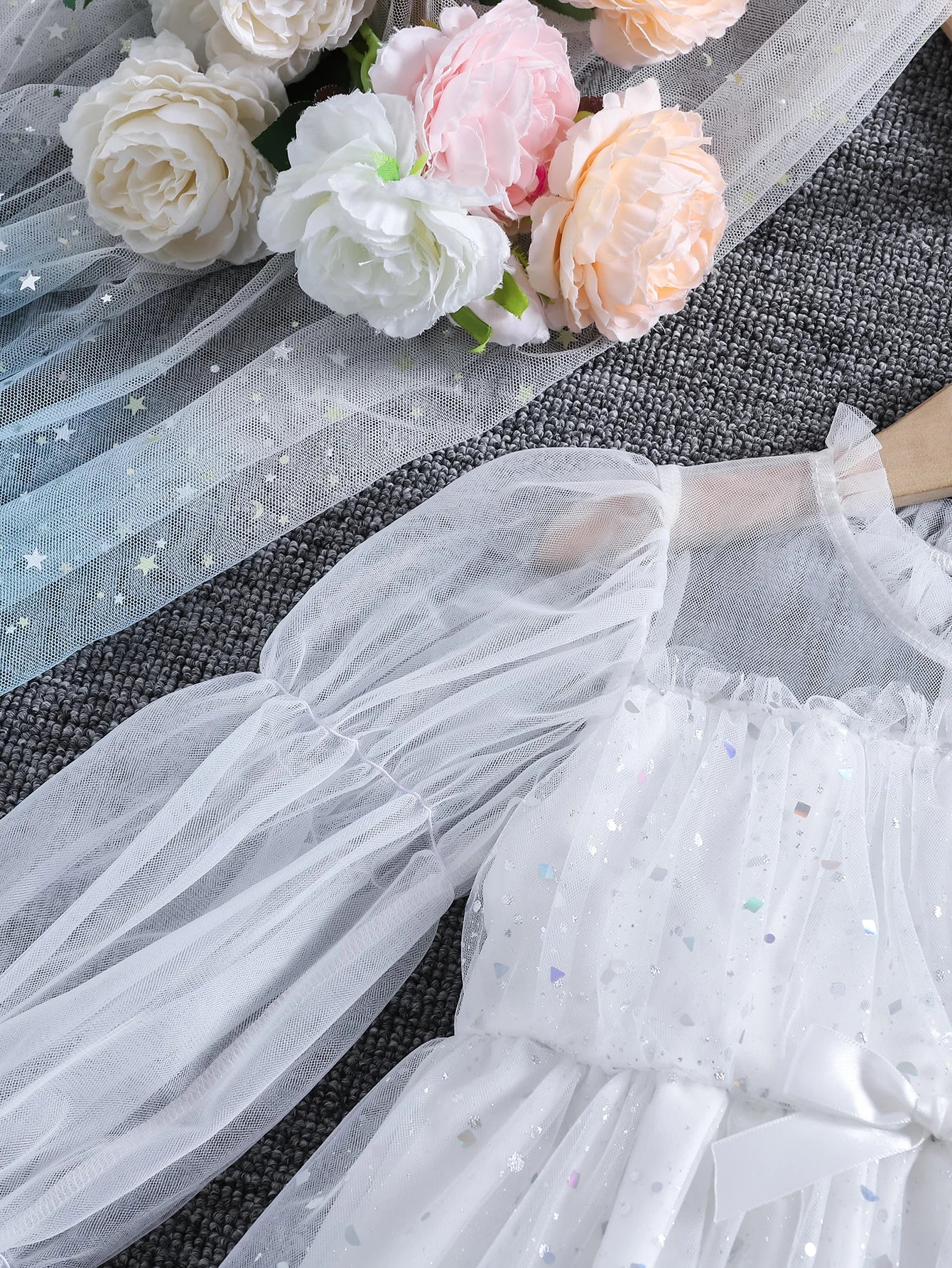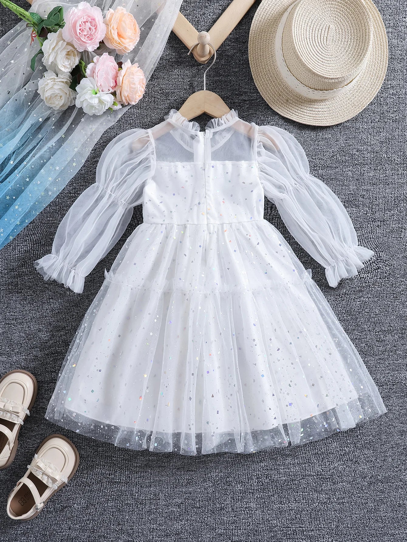 Girls' spring, summer and autumn fashionable sequined mesh puffy princess dresses, stand-up collar ruffled long-sleeved ladylike