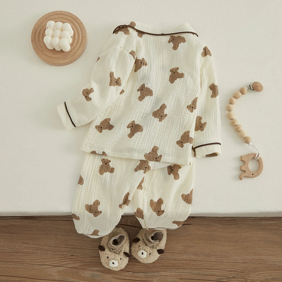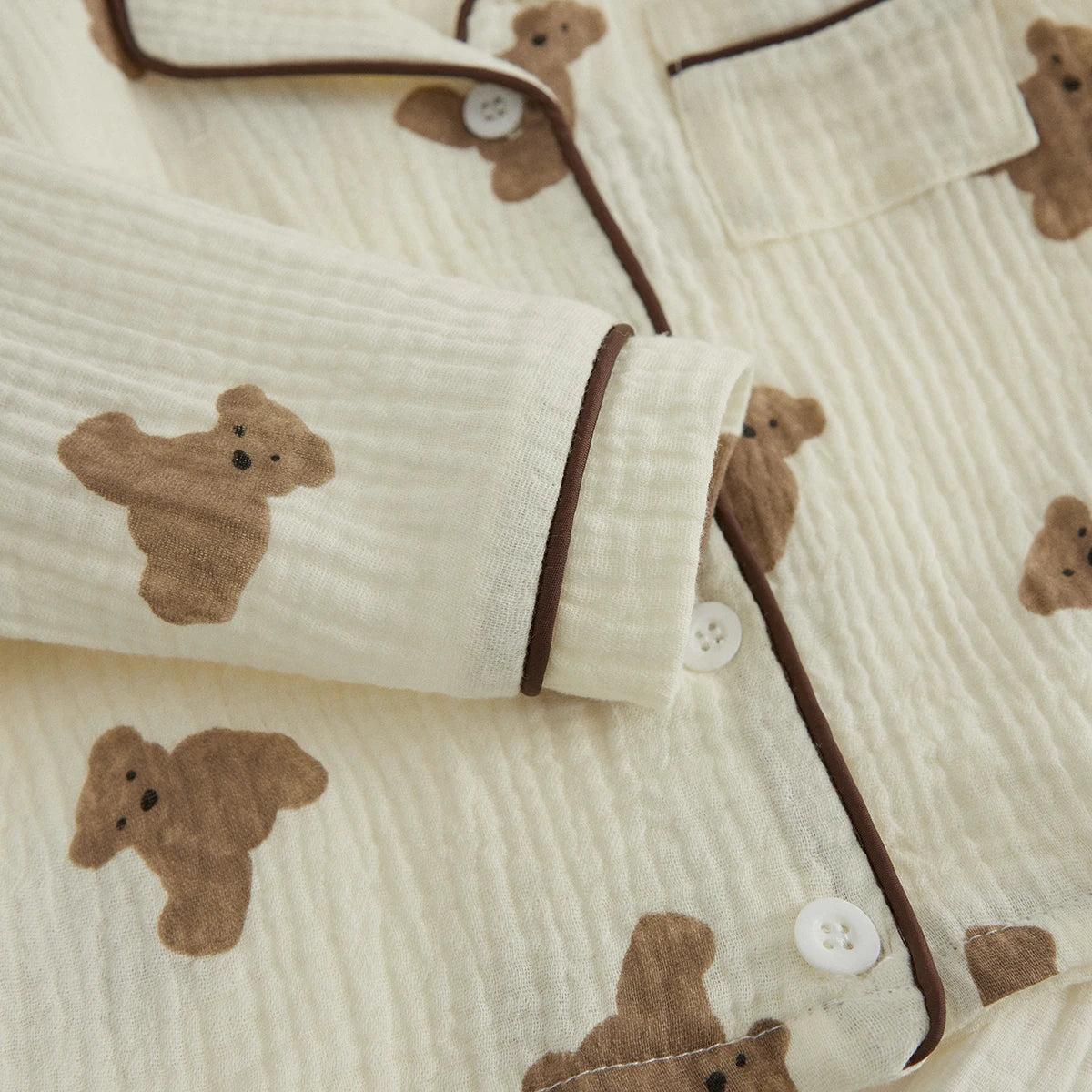 VISgogo Kids Unisex Cotton Linen Pajama Suit Bear Print Long Sleeve Front Pocket Lapel Tops Long Pants Spring Clothes Casual Set