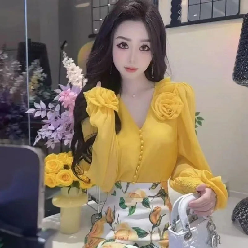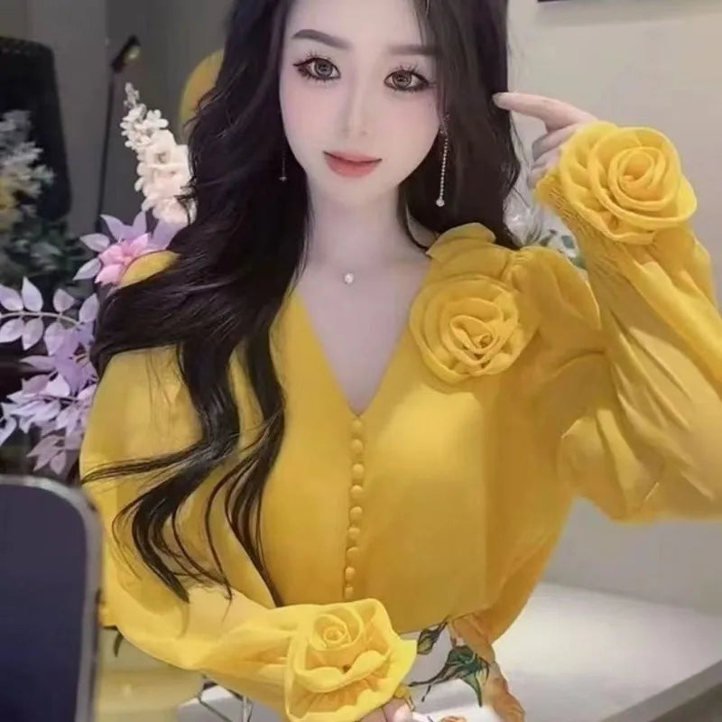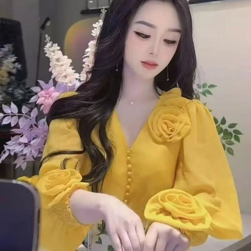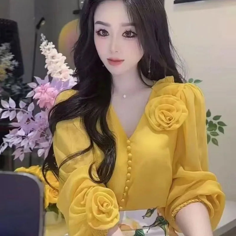 Elegant V-Neck Solid Color Flower Print Loose Long Sleeve Blouse for Women Spring New Arrival
