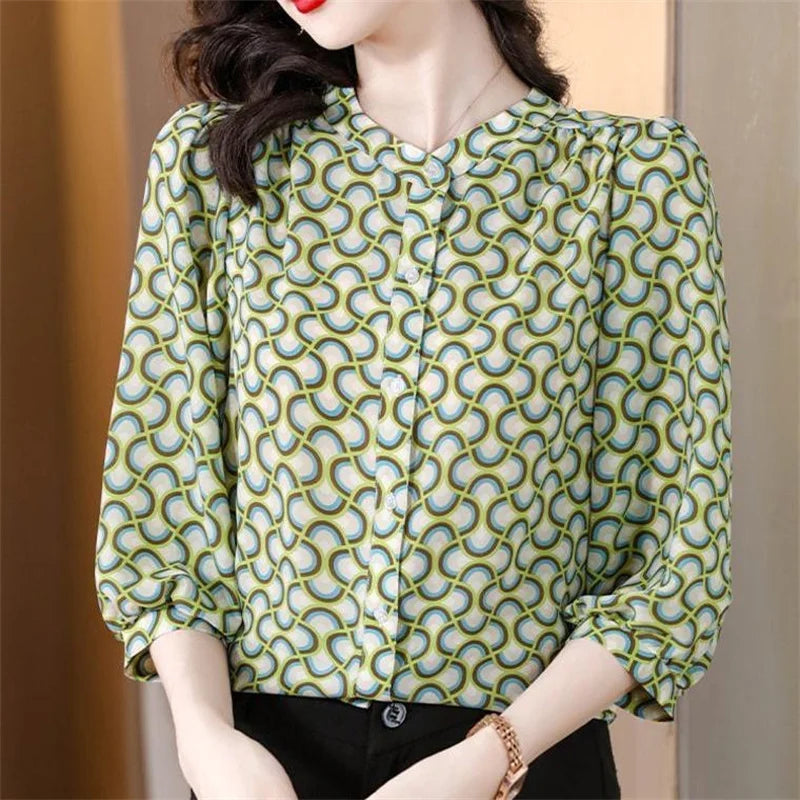 Ladies' spring and summer chiffon shirt, ladies' casual half-puff sleeve stand collar floral print top, three-quarter sleeve hig