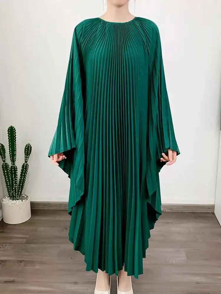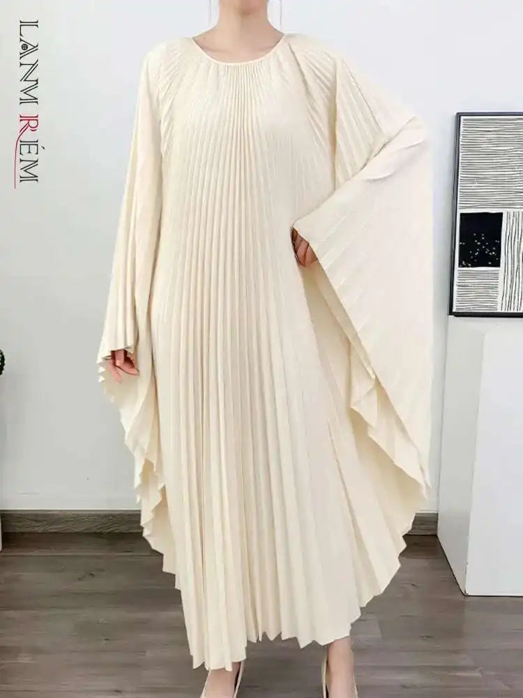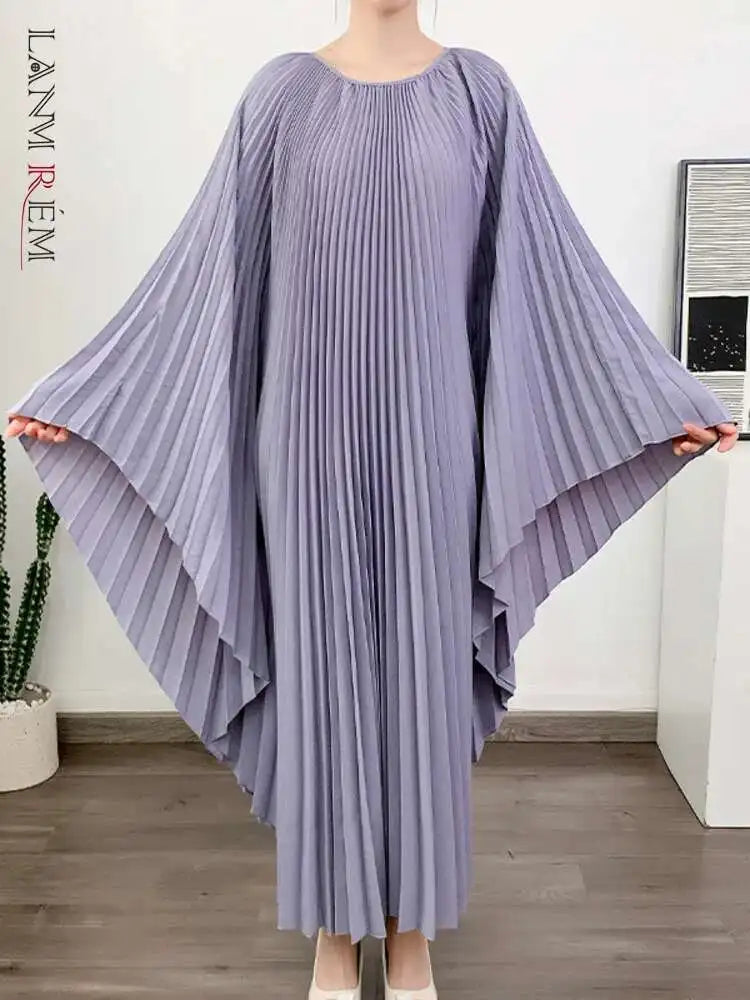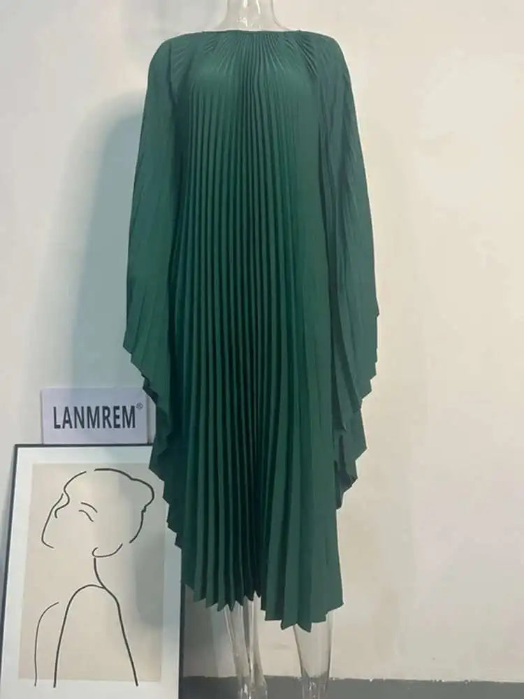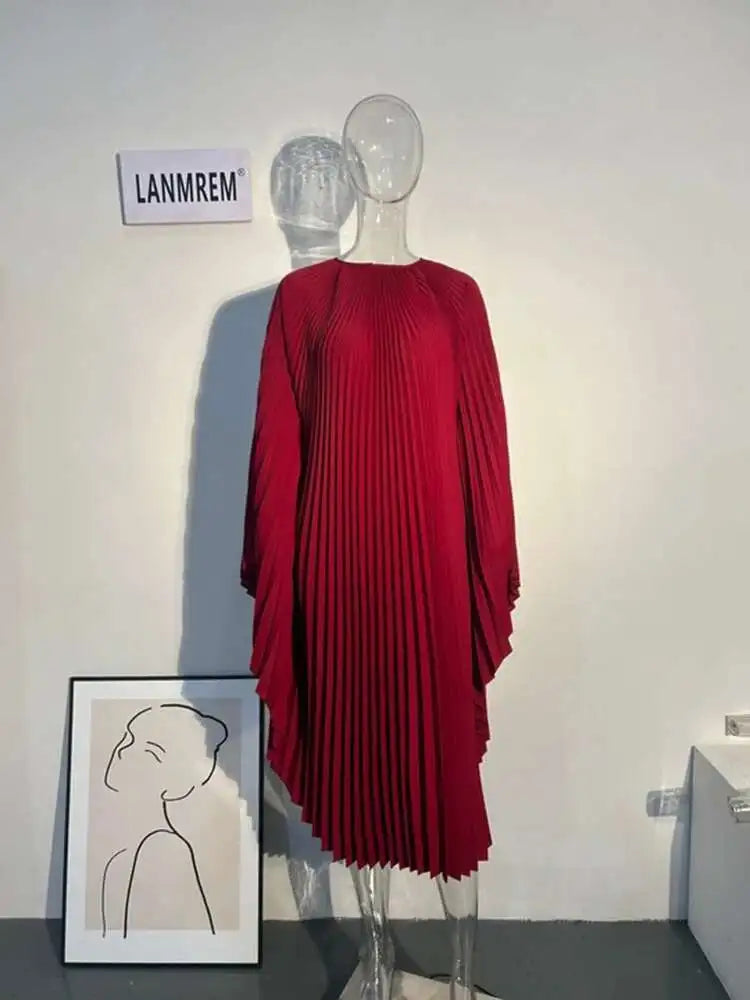 LANMREM Pleated Irregular Dress Round Neck Batwing Sleeves Solid Color Loose Large Style High End Trendy Clothing Autumn 2DA1040