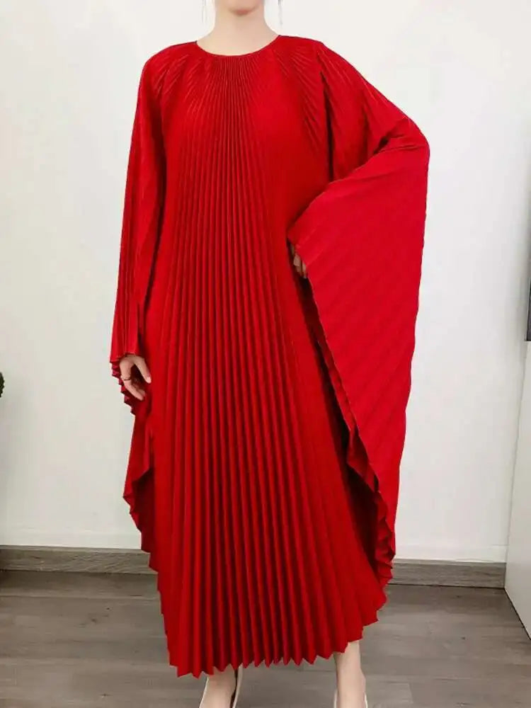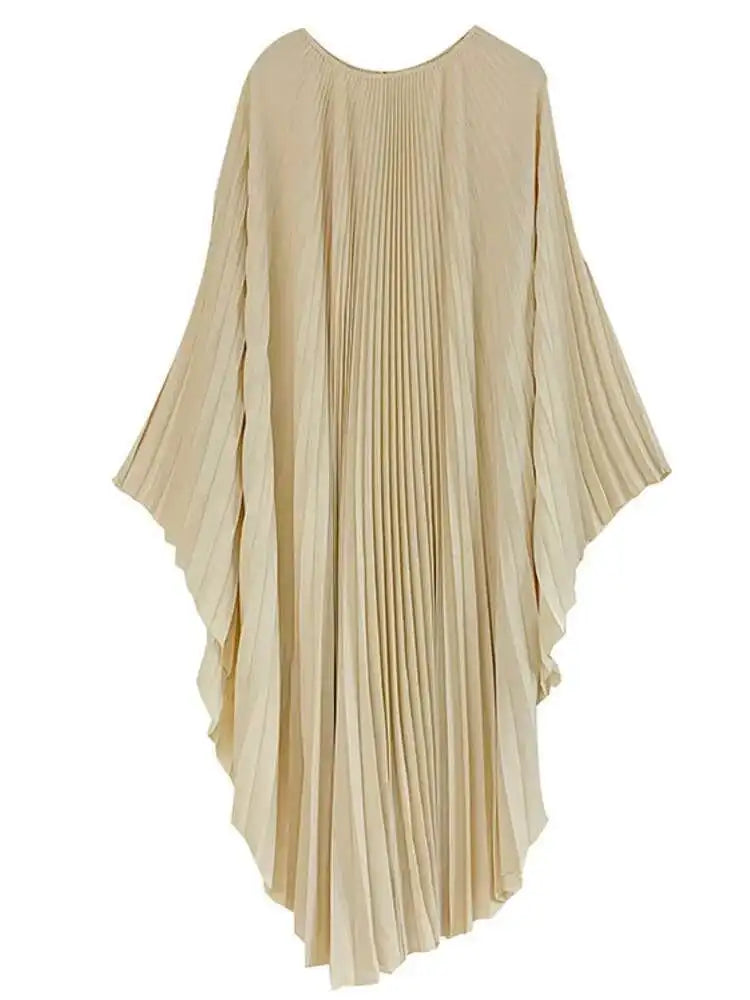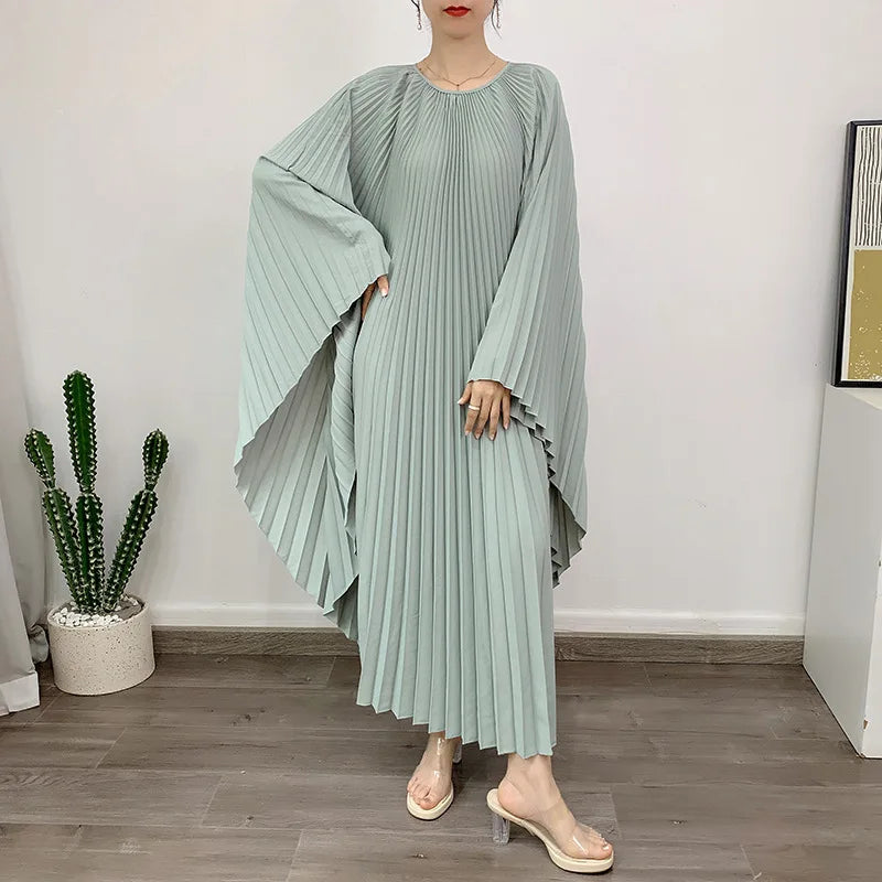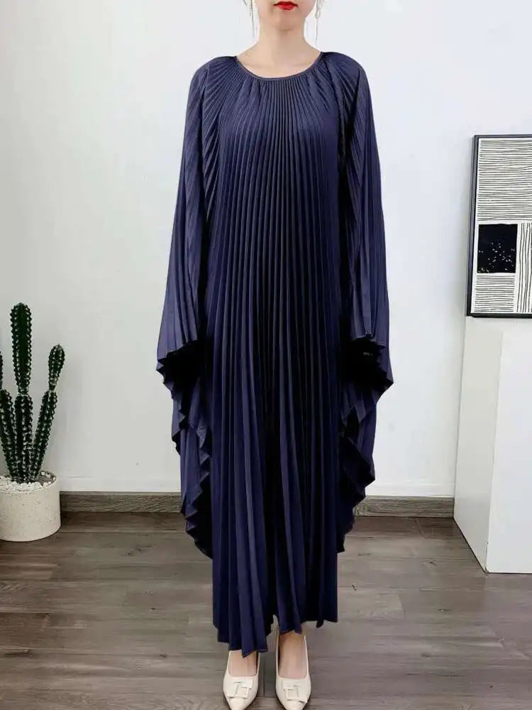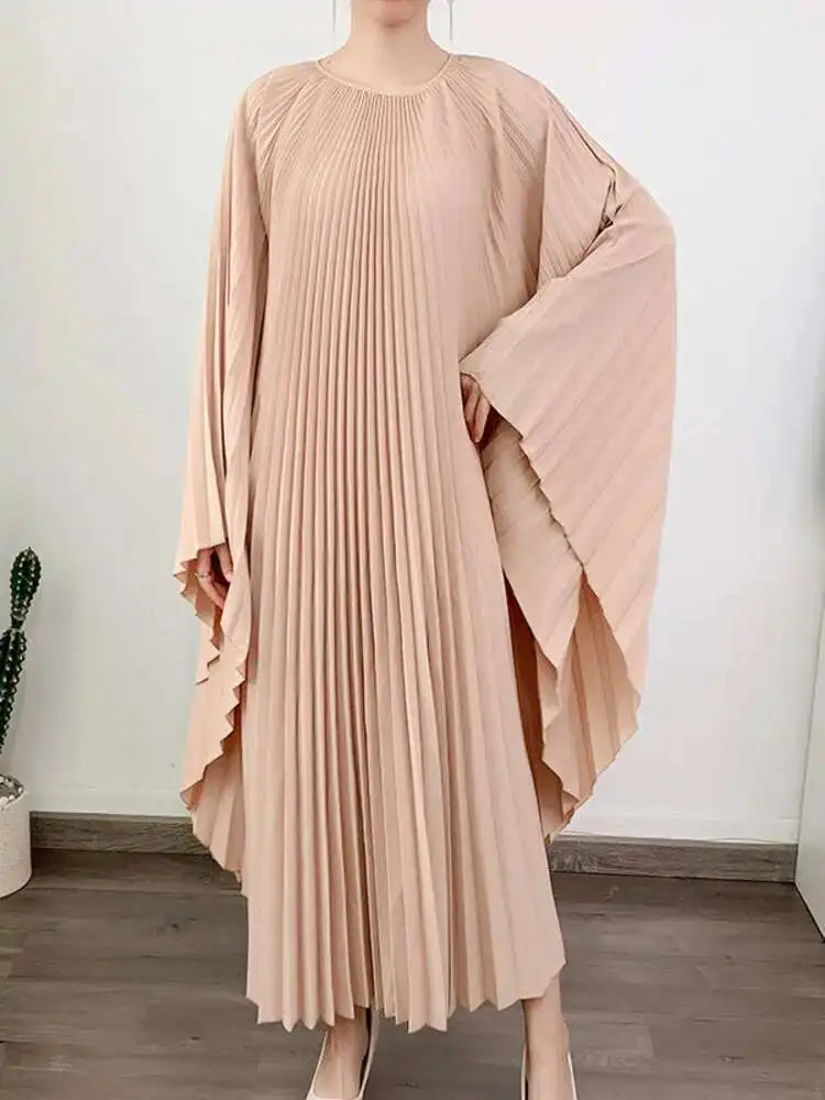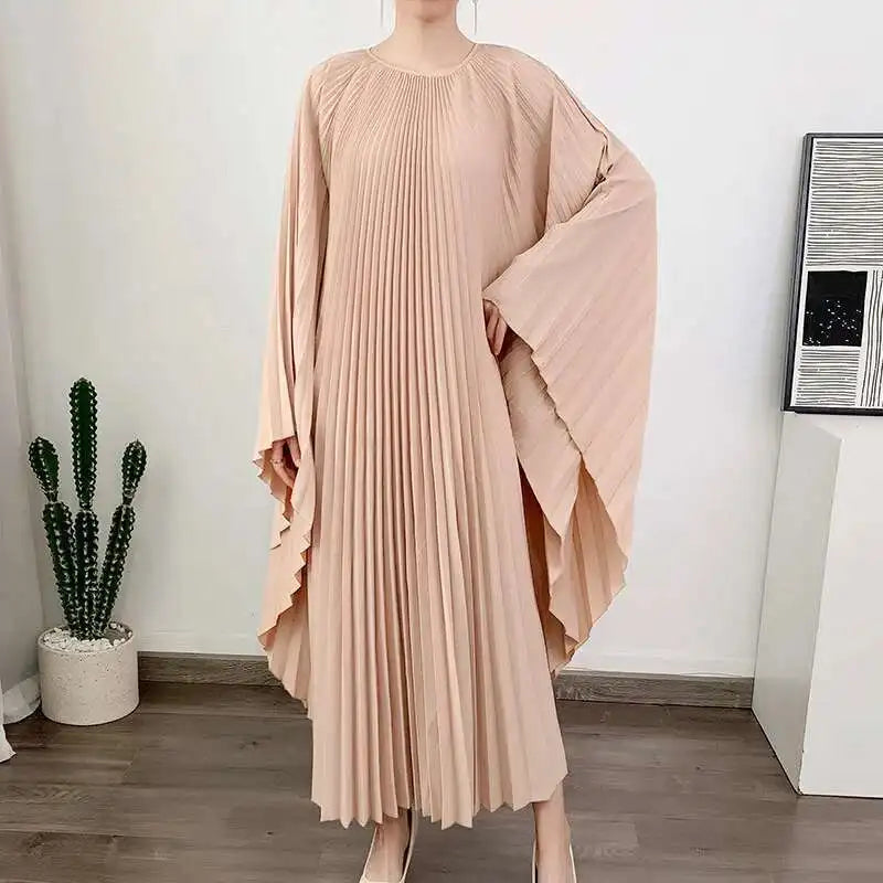 LANMREM Pleated Irregular Dress Round Neck Batwing Sleeves Solid Color Loose Large Style High End Trendy Clothing Autumn 2DA1040
