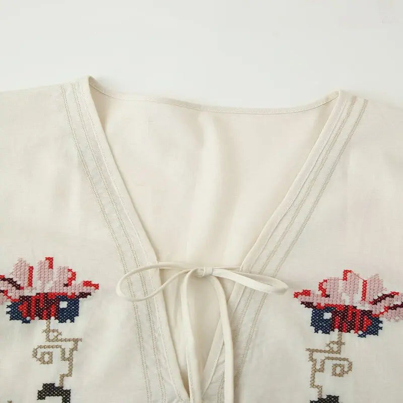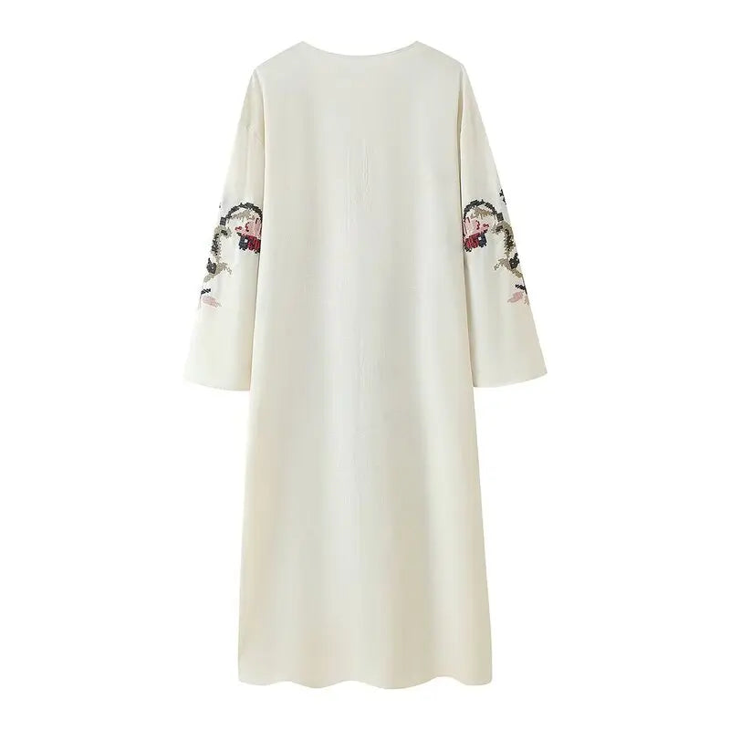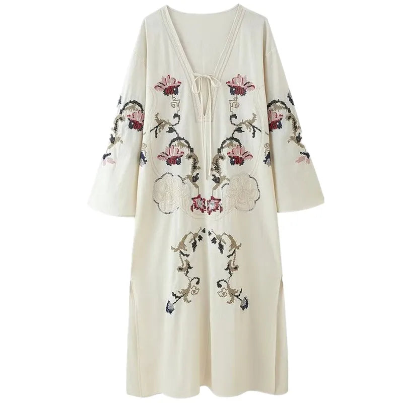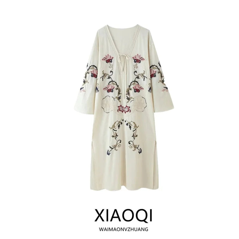 Summer 2025 New Women's Loose Design Sense Flower Embroidery Long Dr Mid-Length A-Line Skirt Sle V-Neline Long Sve