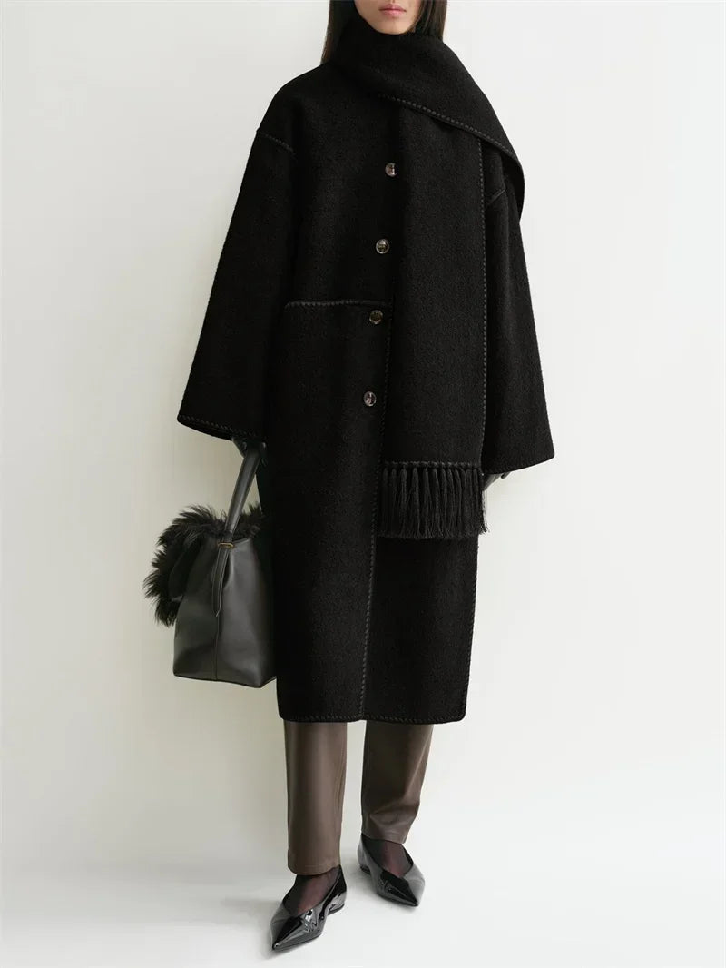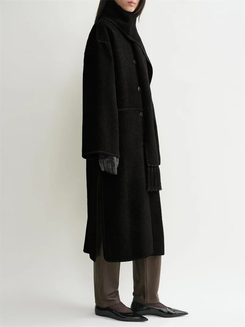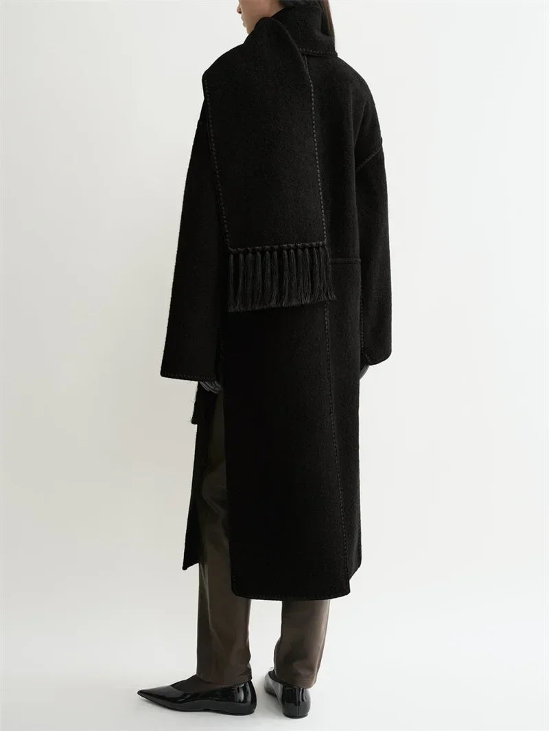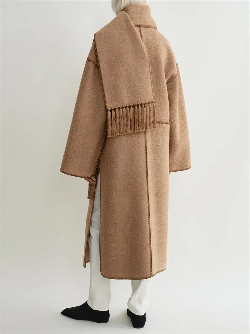 Tassel Scarf Collar Women Mid-length Coat Slit Double-sided Woolen Single Breasted Loose 2025 Autumn Winter Female Jacket