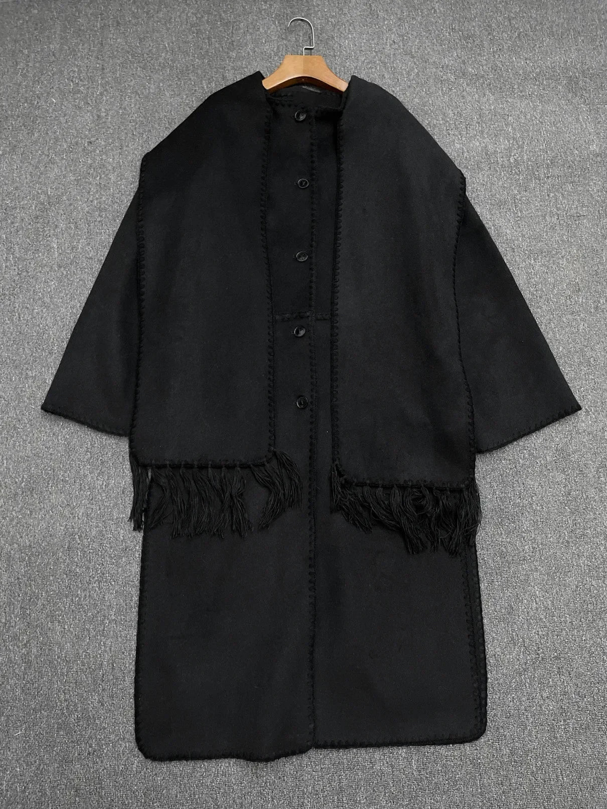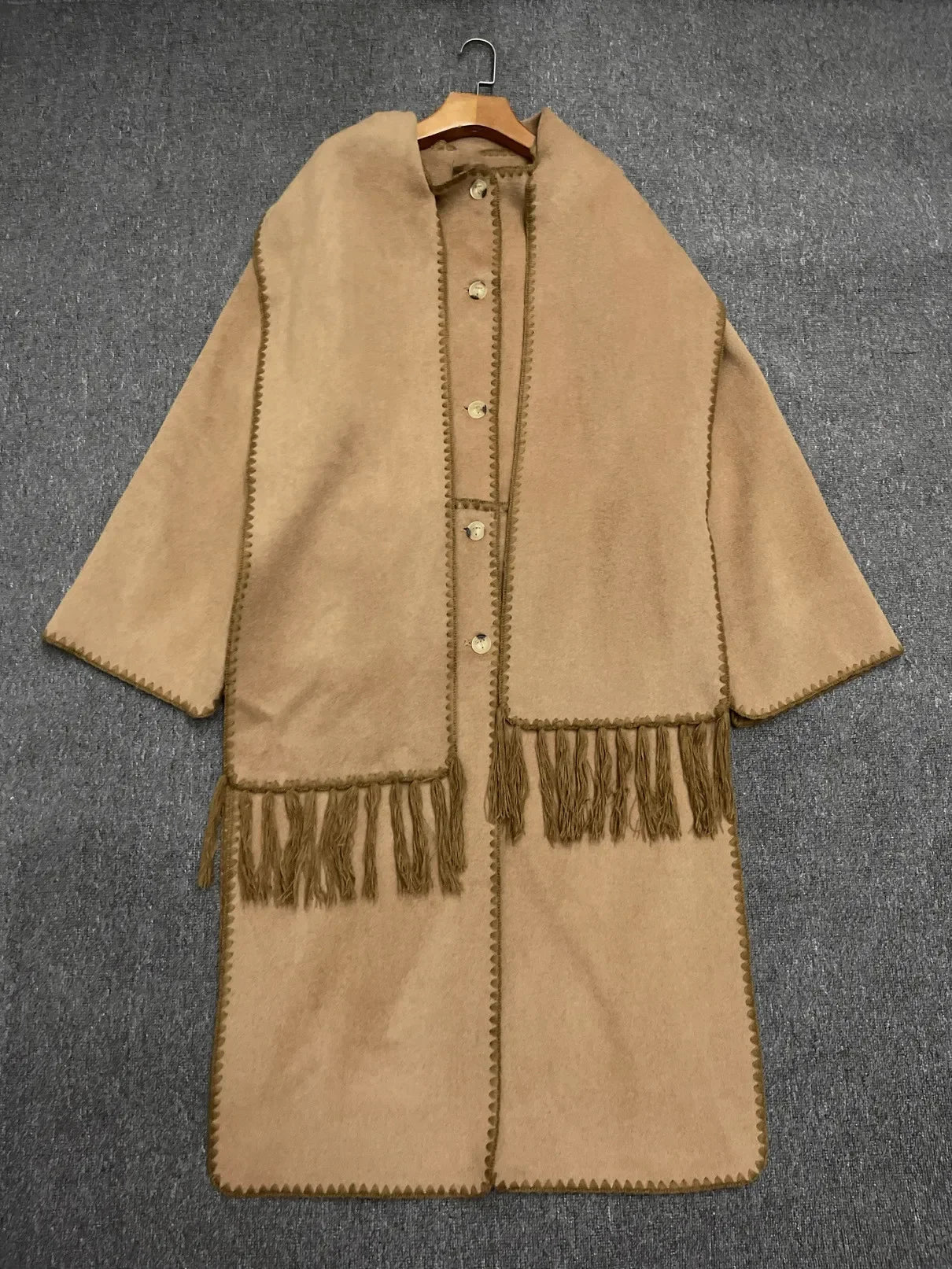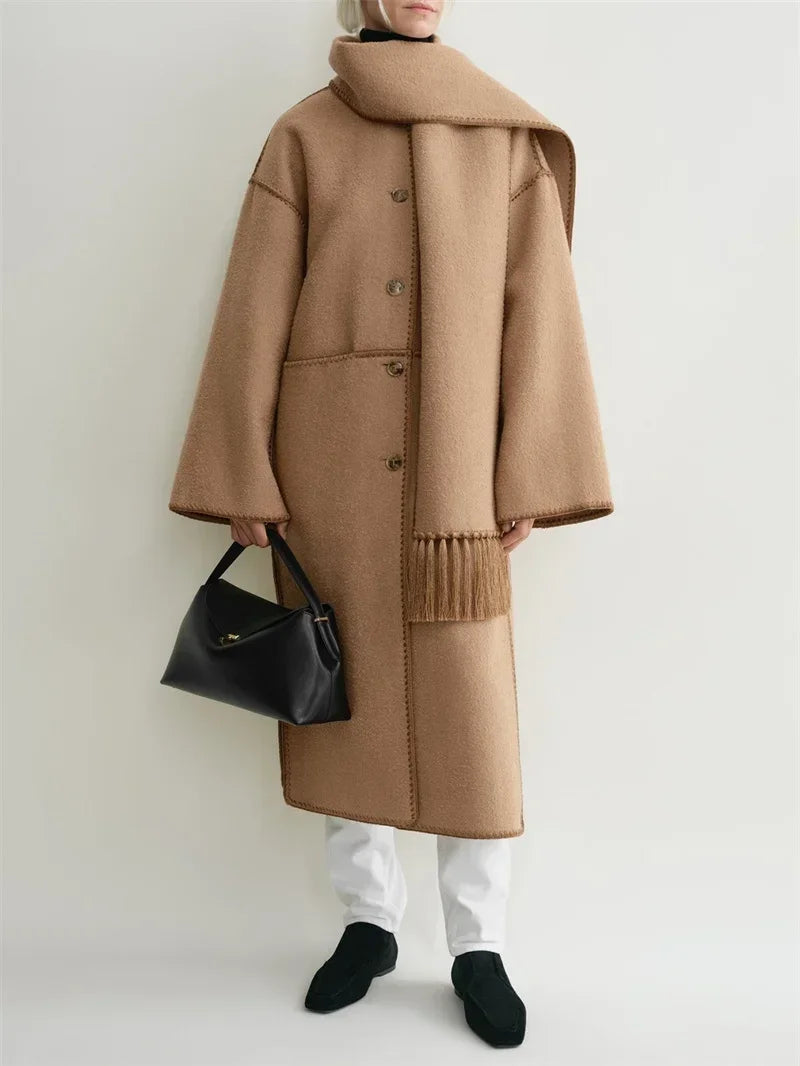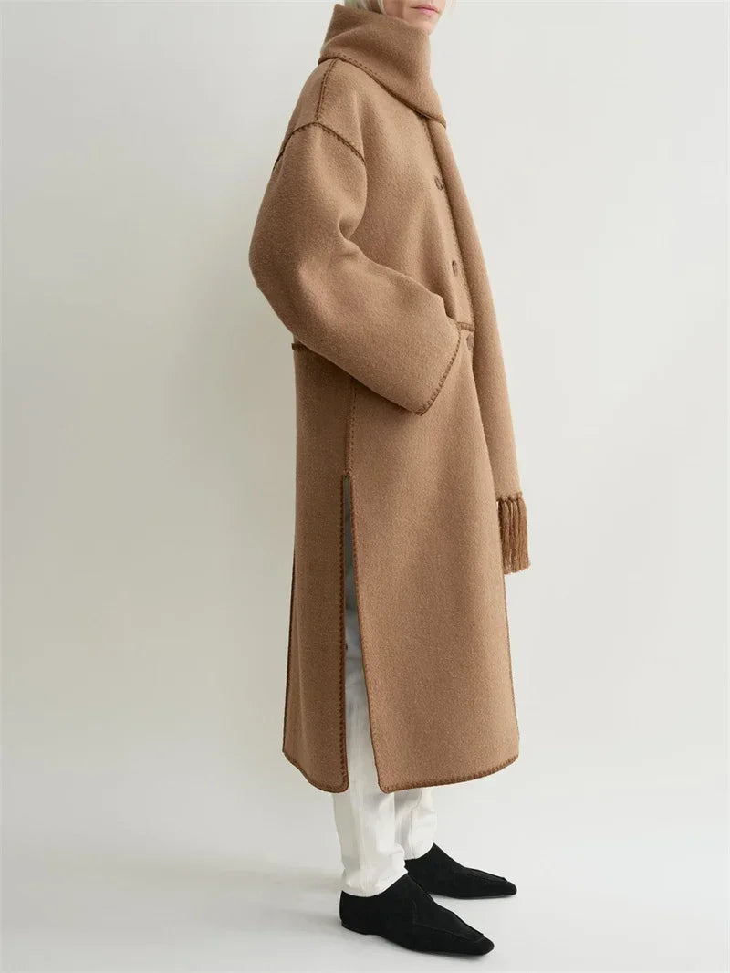 Tassel Scarf Collar Women Mid-length Coat Slit Double-sided Woolen Single Breasted Loose 2025 Autumn Winter Female Jacket