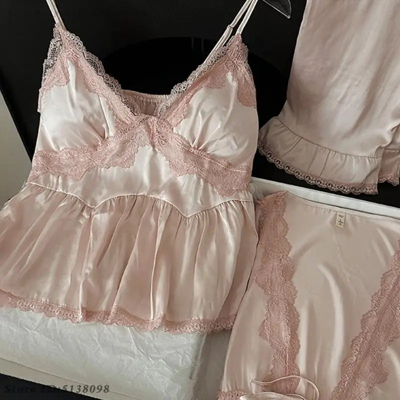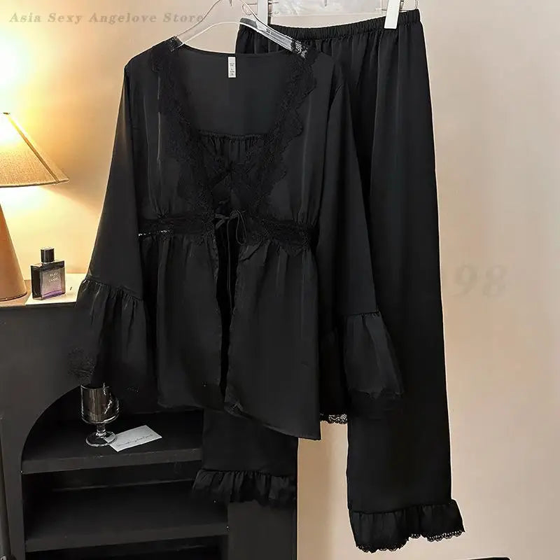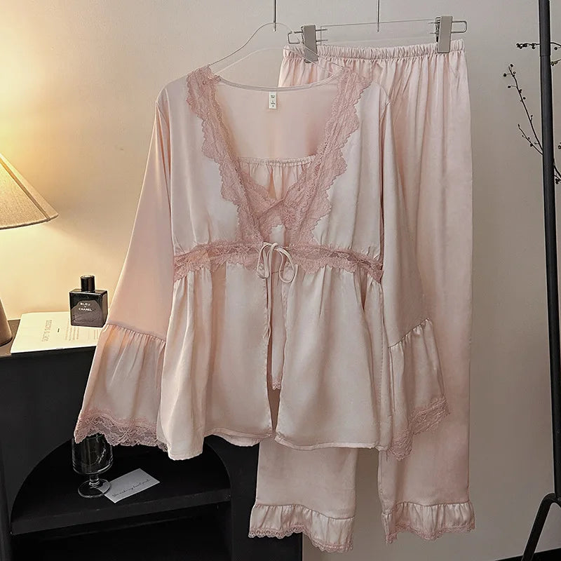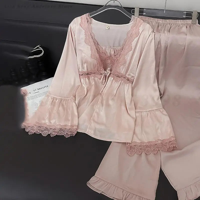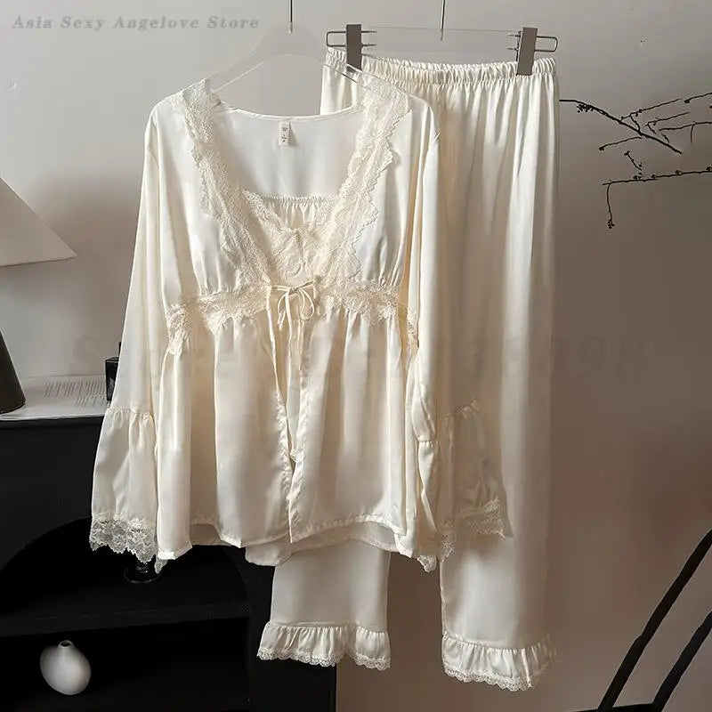 Female 3PCS Pajamas Set Sexy Lace Long Sleeved Cardigan Cami&Trouser Sleepwear Spring Summer New Casual Nightwear Home Clothes