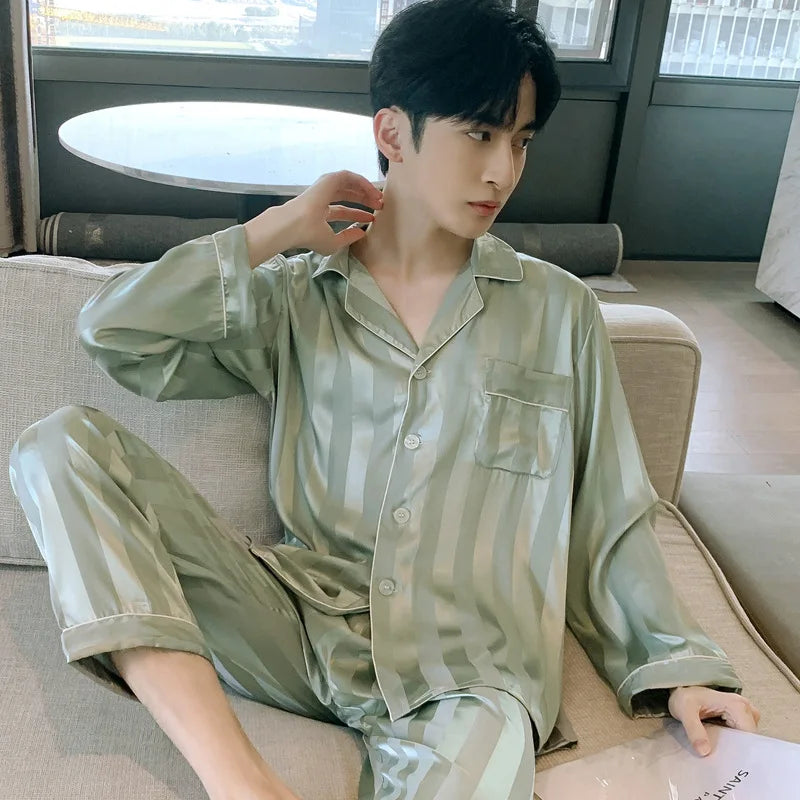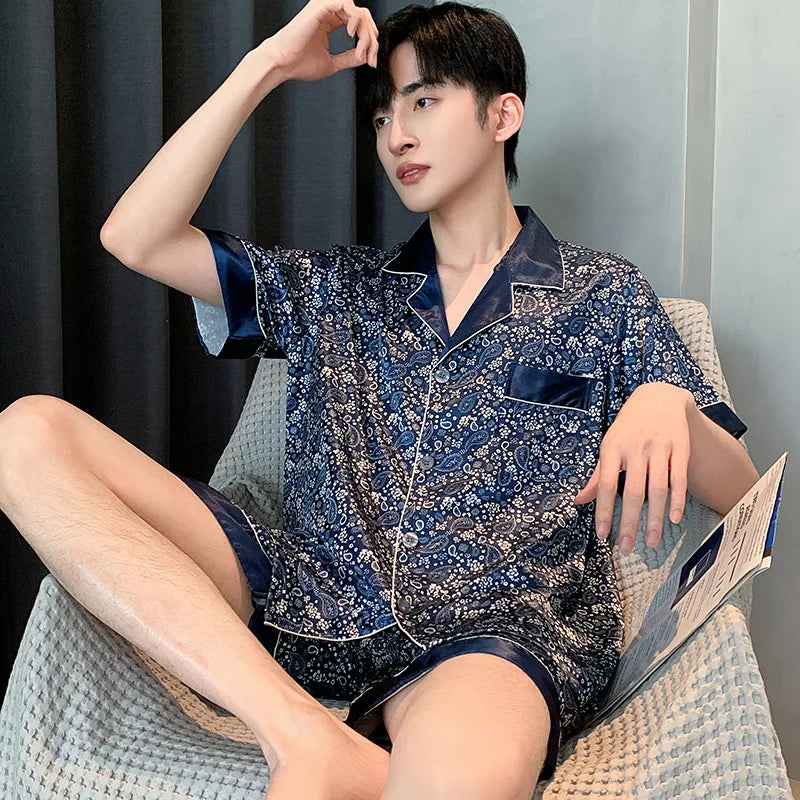 Pajamas Men Spring Summer Thin Ice Silk Luxurious Loose Fitting Home Wear Suit Male Satin Pyjamas Set Night Pajamas Set Men