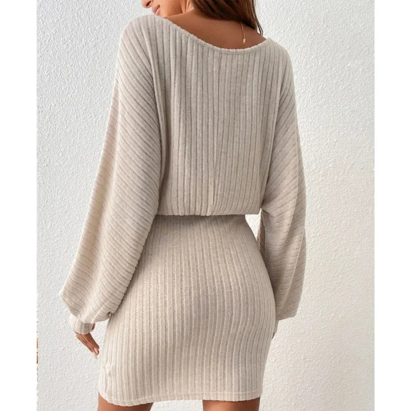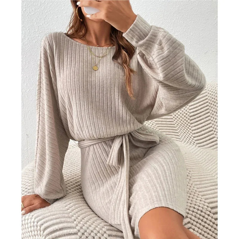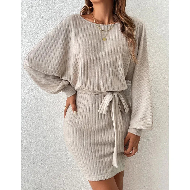 2023 Autumn and Winter Women's New Fashion Belt Decoration Bat Long Sleeve Pit Stripe Fleece Loose Relaxed Knitted Dress
