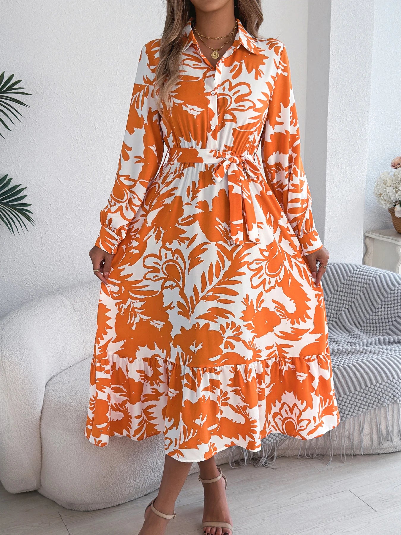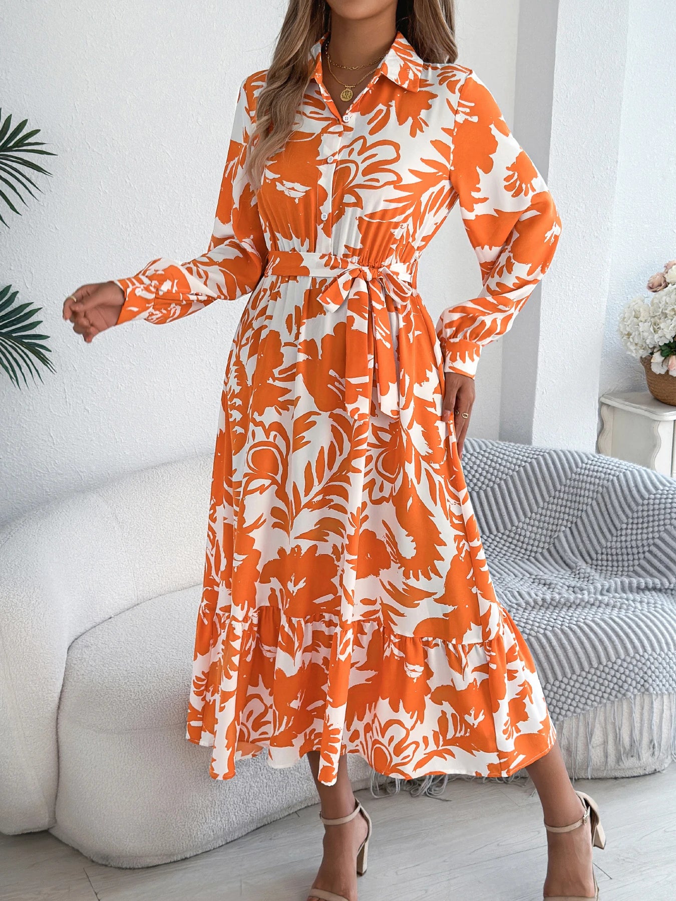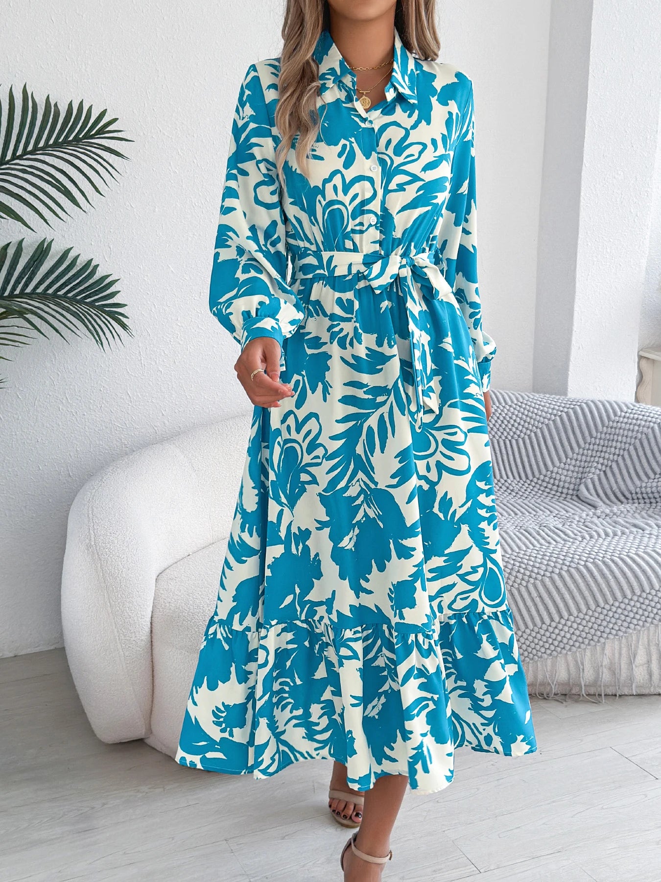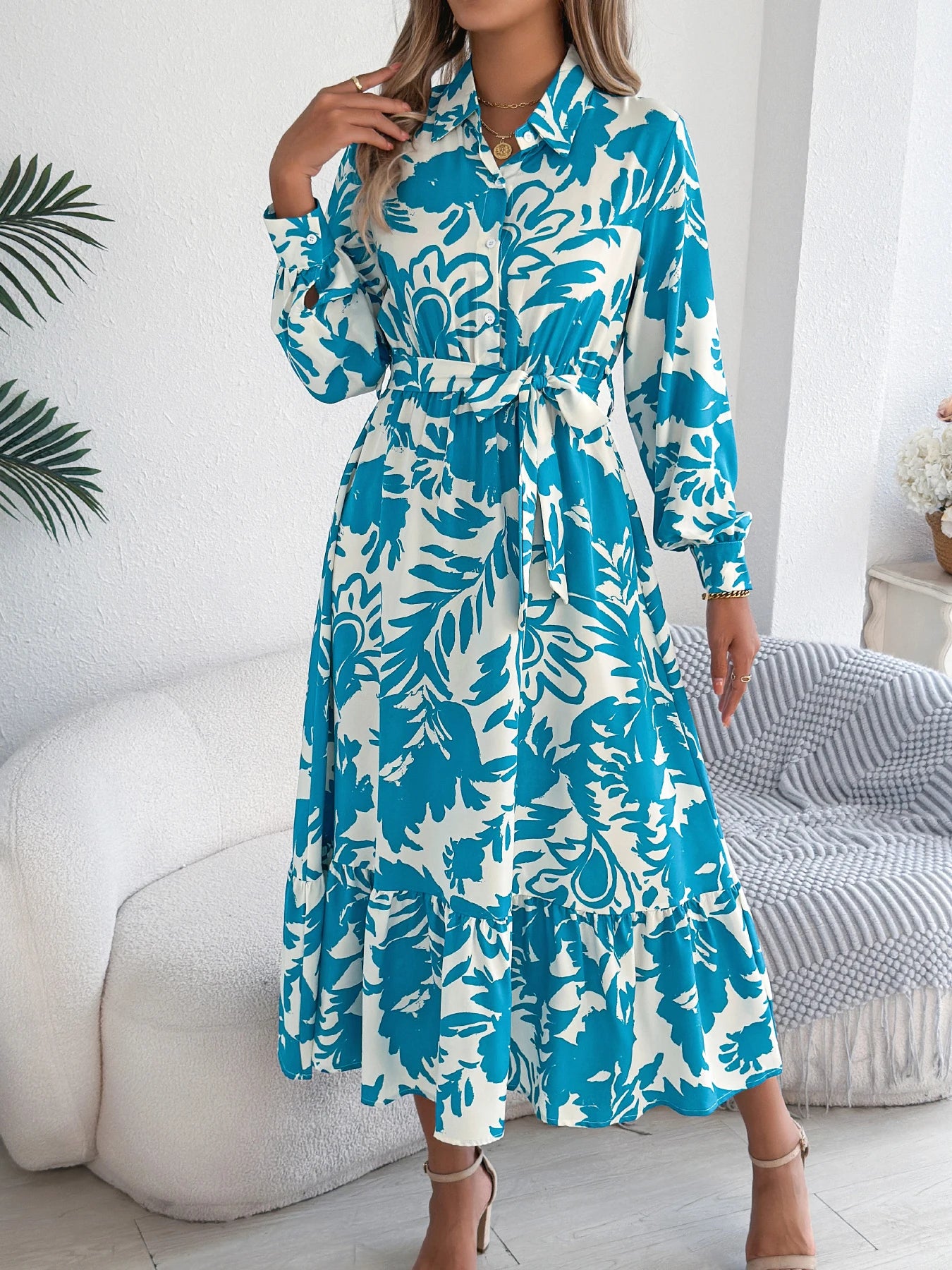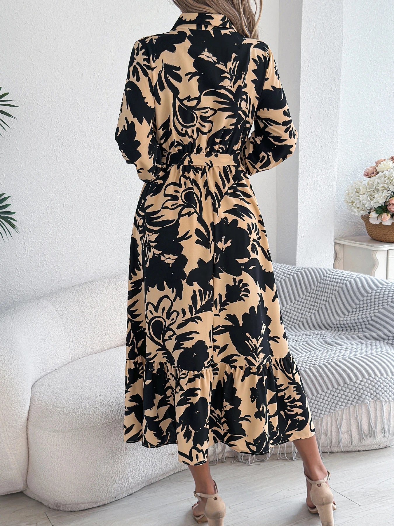 2025 Autumn Elegant Lace Up Floral Dress Woman Single Breasted Turn Down Collar Long Sleeve Ruffled Maxi Dresses