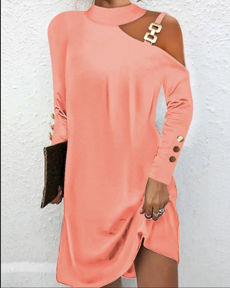 Women's Dress Long Sleeve Shift Dress Autumn 2024 Elegant Simple Metal Buckle Halter Neck Button Dress Women's Work Mini Dress